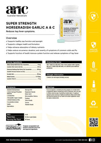 Super-Strength Horseradish Garlic A & C helps to relieve mucous congestion and catarrh caused by common colds, mild sinusitis or mild upper respiratory tract infections. This formula combines the decongestant actions of horseradish with the natural cold & respiratory symptom-relief properties of garlic.