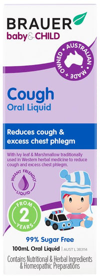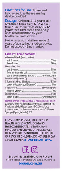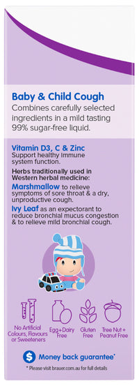 Brauer's Baby & Child Cough contains ingredients traditionally used in Western herbal medicine to reduce cough and excess chest phlegm (Ivy leaf), and relieve throat irritation (Marshmallow).