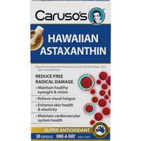 Caruso’s Hawaiian Astaxanthin is naturally sourced from Red Marine Algae grown in Hawaii. Astaxanthin is a naturally occurring carotenoid pigment, which lends its vibrant red-orange colour to foods like krill, algae, salmon and lobster. Astaxanthin is a powerful antioxidant that has the ability to reduce free radical damage and also decrease the free radical damage caused to body cells by oxidative stress. Astaxanthin exerts its effects in many body systems including the skin, cardiovascular system and eyes. It also helps with post exercise recovery, improving muscle performance and increasing physical endurance and stamina.