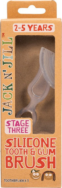 Jack N' Jill Silicone Finger Brush - Stage 3 helps young children from ages 2-5 to gently clean small teeth and sensitive gums. This finger brush may look a little strange in shape, but that's because the soft silicone bristles clean the top, bottom, back and front of the mouth all at the same time! Easy for parents to use and for kids to hold on to themselves.