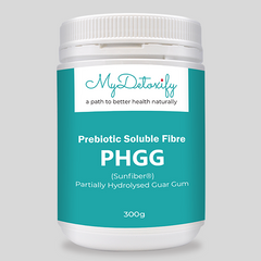 The PHGG is naturally enzymatically hydrolysed to break the viscosity of the Guar Gum into smaller soluble units that dissolve more easily in water. PHGG is a colourless and odourless dietary fibre which contributes to regular laxation (bowel movements) and a valuable prebiotic to support microflora balance, digestive health, intestinal comfort. When consumed in water at meal times it may assist the body to reduce post meal blood sugar spikes by decreasing the glycemic index of foods.