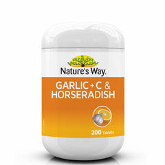 Nature's Way Garlic + C & Horseradish may help to support a healthy immune system and relieve the symptoms of cold and flu and sinus and hayfever. This formula contains a blend of horseradish, garlic, fenugreek, marshmallow and vitamin C which may assist in clearing congestion and opening up nasal passages.