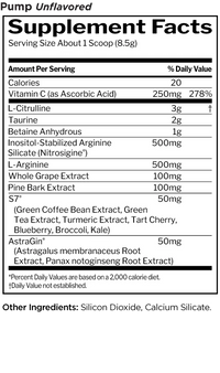 Pump is available in flavored and unflavored varieties and may be used as a standalone for stim-free training, or combined with high-intensity workout formulas for enhanced benefits.^